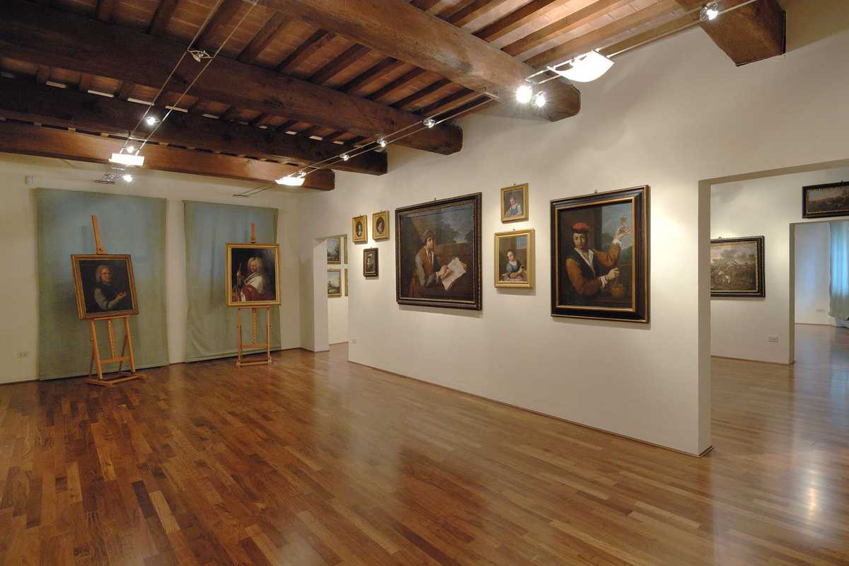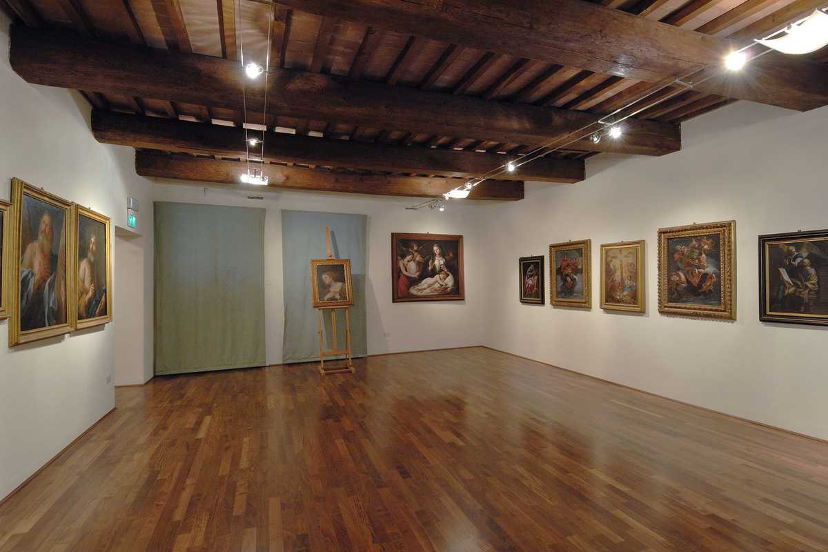 Di particolare interesse sono una bifora trecentesca, forse appartenente a un'ala demolita del palazzo, una stele frammentaria con iscrizione dedicatoria all'imperatore Adriano, un' anfora romana in terracotta, una colonna sormontata da un capitello, una statua priva di testa raffigurante il Dio Tiberino, una lastra altomedievale con motivi decorativi animali e vegetali e un prospetto di tabernacolo del XVI sec. in pietra serena. L' ingresso all'atrio è libero. A sinistra si trova l'ingresso alla pinacoteca da dove incomincia il percorso espositivo.