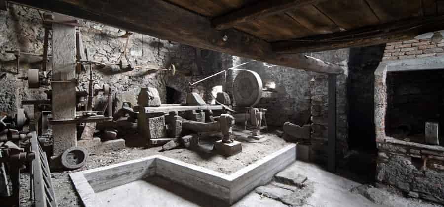 La fucina operava tramite una forgia costruita in un antico edificio in pietra. Una ruota collocata sul canale che derivava le acque del rio Pissaglio verso l'abitato di Bruzolo, costruita in legno e pietra (a mo' di volano), serviva a dare il moto ai magli. Questi erano collegati alla ruota tramite un albero ligneo di trasmissione del moto. La fucina antica con la ruota in funzione venne ripresa dalla RAI - Radio Televisione Italiana negli anni '60 per descriverne il funzionamento.