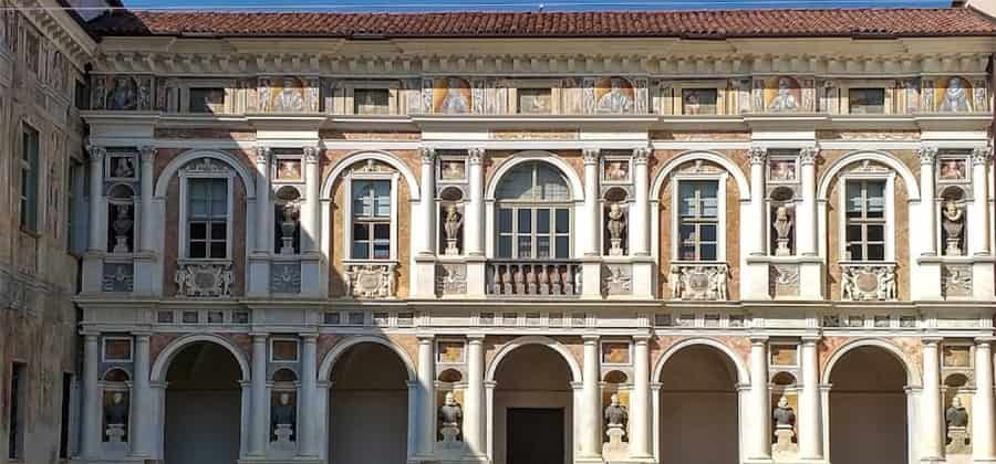 Palazzo Muratori Cravetta sorge lungo "Contrada Jerusalem" un tempo nota come la Contrada dipinta, per le numerose facciate affrescate, che facevano da sfondo alle processioni tra la Collegiata di S. Andrea e la Chiesa di San Domenico. La dimora attuale ha origine dall'accorpamento di tre proprietà nobiliari: quella dei Corvo, dei Tapparelli e dei Muratori. Qui soggiornarono personaggi illustri come il Re di Francia Francesco I nel 1515 e l'Imperatore Carlo V nel 1536. La trasformazione dell'edificio nella forma attuale fu intrapresa da Giovanni Francesco I Cravetta, Primo Presidente del Senato ducale, e conclusa dal nipote Giovanni Francesco II.