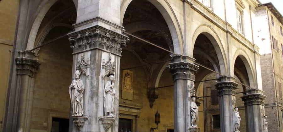 La loggia è composta da tre arcate su pilastri riccamente decorati, con le facce recanti tabernacoli con statue. Le due statue sui pilastri esterni della loggia raffigurano San Pietro e San Paolo e sono del Vecchietta (1458-1462); le altre tre statue raffigurano tre dei quattro antichi santi protettori della città, San Savino, Sant'Ansano e San Vittore, e sono di Antonio Federighi (1458-1459).