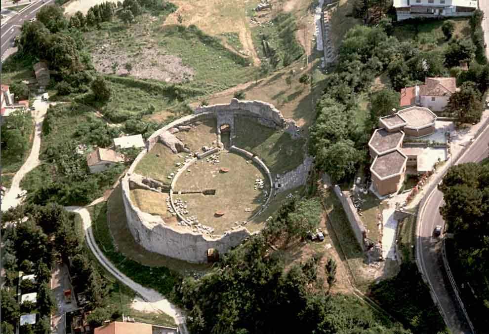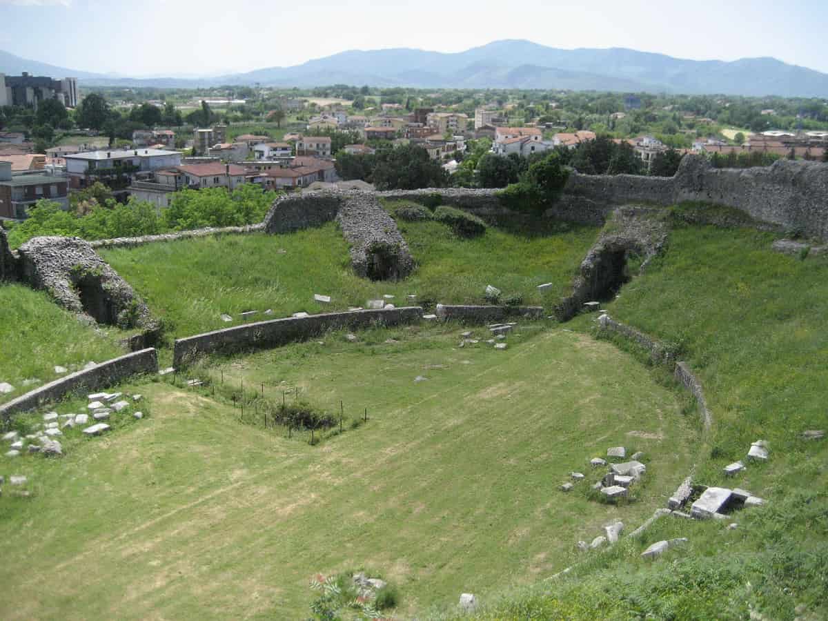 L’anfiteatro è probabilmente la costruzione più importante di tutto il complesso. Venne realizzato nel I secolo d.C. dalla matrona Ummidia Quadratilla subito fuori dal centro abitato di Casinum, ciò è confermato da una lapide ritrovata nel 1757. Dalla classica forma ellittica, l’anfiteatro è lungo 85 metri e largo 69 e poteva ospitare circa 4000-4500 spettatori suddivisi su 12 gradinate. Lungo il perimetro della struttura oltre ai tradizionali fornici erano situate anche delle feritoie che accoglievano i pali di sostegno del velarium. Come tutte le strutture di questo genere anche l’anfiteatro di Casinum veniva utilizzato per i combattimenti dei gladiatori e vista la presenza di numerose sorgenti probabilmente anche per spettacolari battaglie navali.