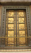 Tra il 1330 e il 1336 viene eseguita la prima delle tre porte bronzee, con l'utilizzo di 24 formelle, commissionata ad Andrea Pisano dall'Arte di Calimala, l'arte più antica dalla quale discendono tutte le altre, sotto la cui tutela era il battistero: essa era di fatto in competizione con l'Arte della Lana che patronava invece il vicino duomo. La terza porta, con formelle interamente rivestite d'oro, eseguita sempre dal Ghiberti tra il 1425 e il 1452 e chiamata da Michelangelo "Porta del Paradiso", tuttora occupa il lato orientale. Per la realizzazione delle due porte, il Ghiberti creò una vera e propria bottega di bronzisti, nella quale si formarono artisti come Donatello, Michelozzo, Masolino e Paolo Uccello.