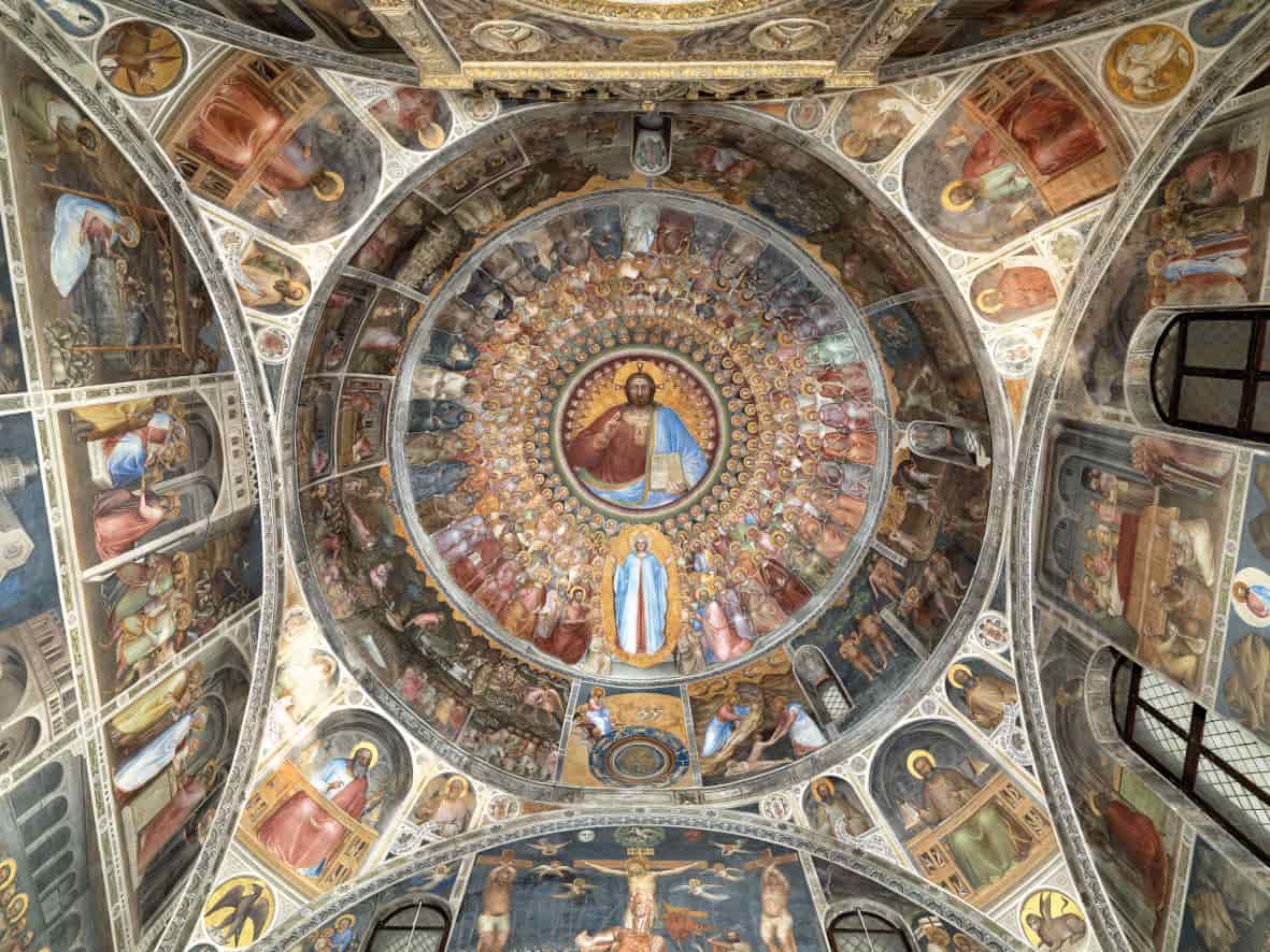 Gli affreschi con cui è decorato (1375-1376) sono considerati il capolavoro di Giusto de' Menabuoi. Rispetto alle esperienze precedenti, a Padova dovette essere colpito dalle ordinate fissità romaniche e bizantine, come testimonia il grande Paradiso nella cupola del Battistero: la scena è organizzata attorno a un Cristo Pantocratore, dove ruota un'ipnotica raggiera a più strati con angeli e santi, le cui aureole in file ordinate ricordano, guardate dal basso, le punzonature di una magnifica oreficeria. Al centro del Paradiso c'è anche la Madre di Dio. I dipinti che coprono le pareti del tamburo raffigurano episodi della vita di san Giovanni Battista (a sinistra dell'ingresso), di Maria e di Gesù. Nella parete adiacente all'altare è rappresentata la Crocifissione, quindi la discesa dello Spirito Santo (affrescata sulla cupola dell'altare). Sull'altare è posto un polittico di Guisto dei Menabuoi. Sulle pareti attorno all'altare, nell'abside, sono affrescate figure mostruose e immagini tratte dall'Apocalisse di Giovanni.