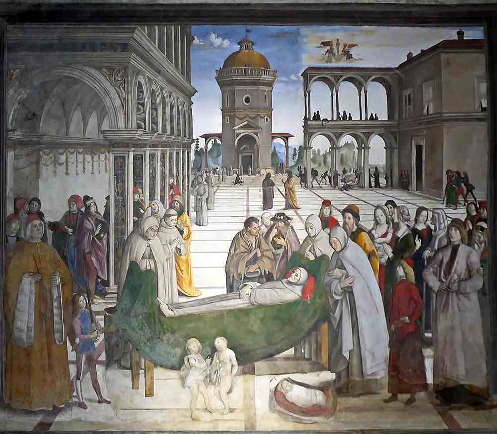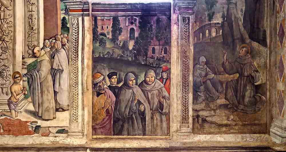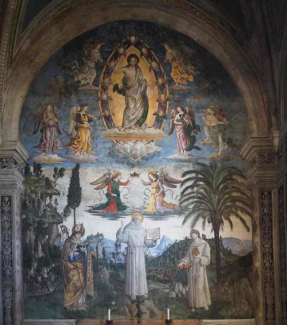 La cappella è a base quadrangolare, con volta a crociera e pavimento decorato da mosaici cosmateschi. Gli affreschi si dispiegano sulle tre pareti e sulla volta e sono dedicati alla vita e ai miracoli di san Bernardino da Siena, un santo che in quel periodo era oggetto di una vasta opera di promozione devozionale intrapresa dall'ordine Francescano. L'Aracoeli era infatti retta dai Minori francescani, e gli affreschi includono infatti anche due storie di san Francesco; inoltre la famiglia Bufalini era particolarmente legata a Bernardino, poiché con la sua predicazione aveva sedato le discordie tra i Bufalini e i rivali Baglioni e Del Monte.