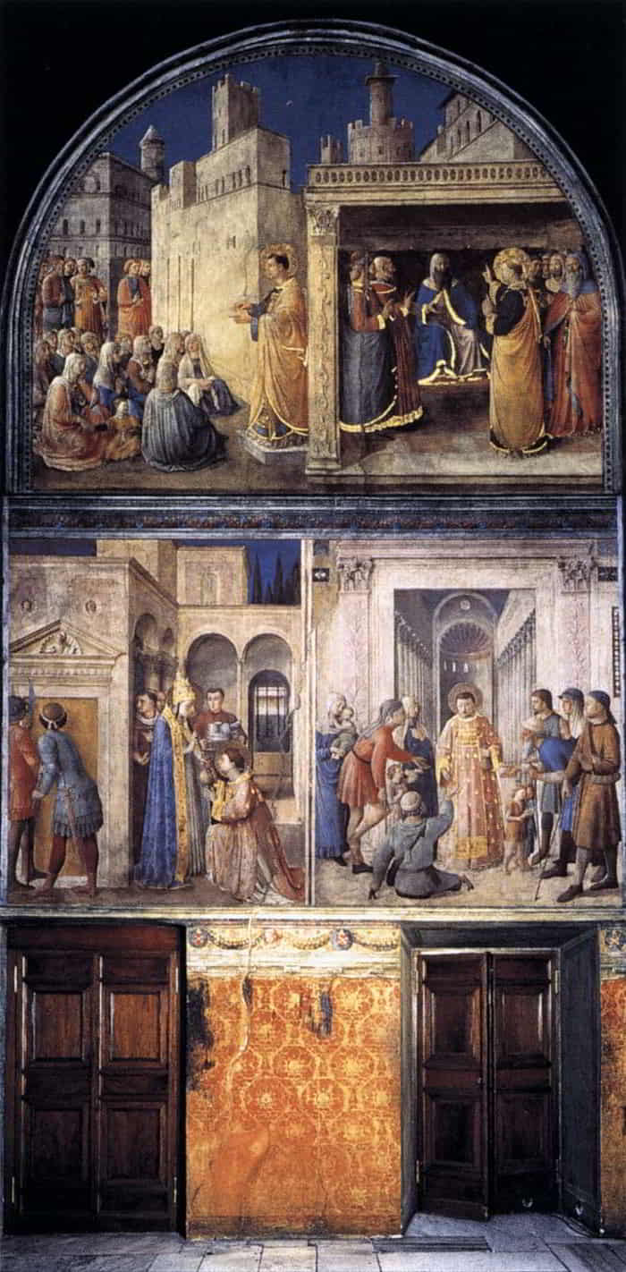 La Cappella Niccolina è a pianta rettangolare e consta di tre pareti, decorate ciascuna nel registro superiore da un grande lunettone con un affresco unico composto da due Storie di santo Stefano; il registro mediano è invece composto da due scene separate per parete con Storie di san Lorenzo, tranne la parete sinistra, con le finestre, che contiene una sola storia; il registro inferiore, dove si aprono alcune porte, è infine decorato da una finta tappezzeria verde, oggi in larga parte ridipinta successivamente con una predominanza di colori rosso e oro.