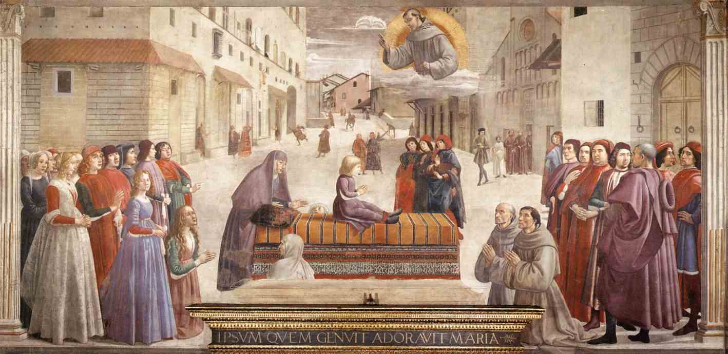 Il ciclo affrescato della Cappella Sassetti fa suo l'impianto compositivo della Cappella Brancacci, con le diverse scene suddivise in due piani sovrapposti e delimitate da pilastri scanalati, con un'applicazione rigorosa della prospettiva. Lo spazio, razionale e civile, mostra spesso squarci di vita quotidiana fiorentina, armonizzate con le scene sacre in primo piano. I personaggi contemporanei, ritratti con precisione nella loro dignità e raffinatezza, arrivano ad essere protagonisti del vivace racconto. Tra le varie influenze si possono cogliere le citazioni archeologiche, la minuzia nei dettagli di stampo fiammingo e la tradizione fiorentina da Giotto in poi. La vena narrativa è ricca e feconda e, seppure sia quasi estranea al pathos concitato, privilegia l'armonia lineare, l'uso di colori luminosi e sereni, l'atmosfera serena.