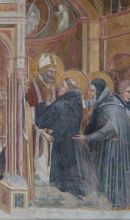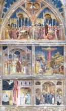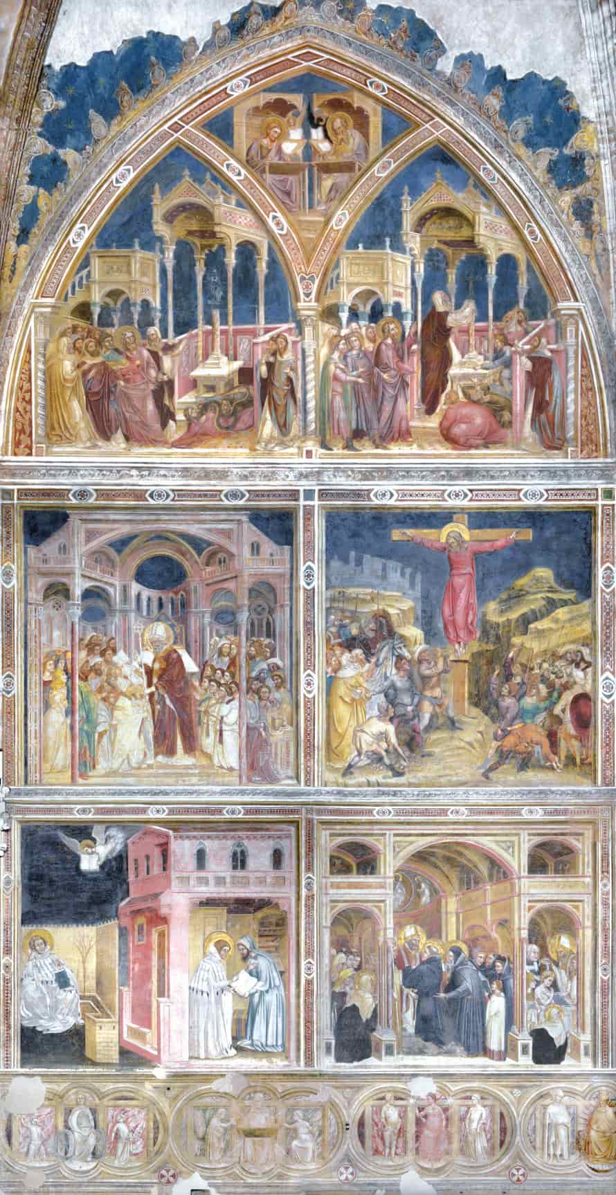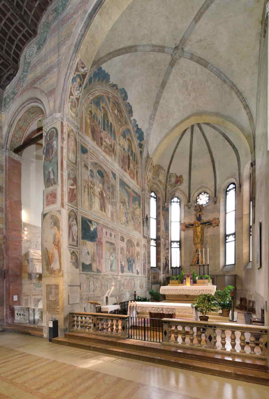 La cappella maggiore è decorata da un ciclo di affreschi di Guariento che dopo le distruzioni belliche ricopre solo la parete sinistra, con le Storie di san Filippo e sant'Agostino nei tre registri superiori e nello zoccolo a monocromo le allegorie dei Pianeti e delle Età dell'uomo: chiaramente questa parte della decorazione è influenzata dai poco lontani affreschi di Giotto nella cappella degli Scrovegni. L'attività pittorica di Guariento nell'abside maggiore è da far risalire per via stilistica agli anni 1361-1365.