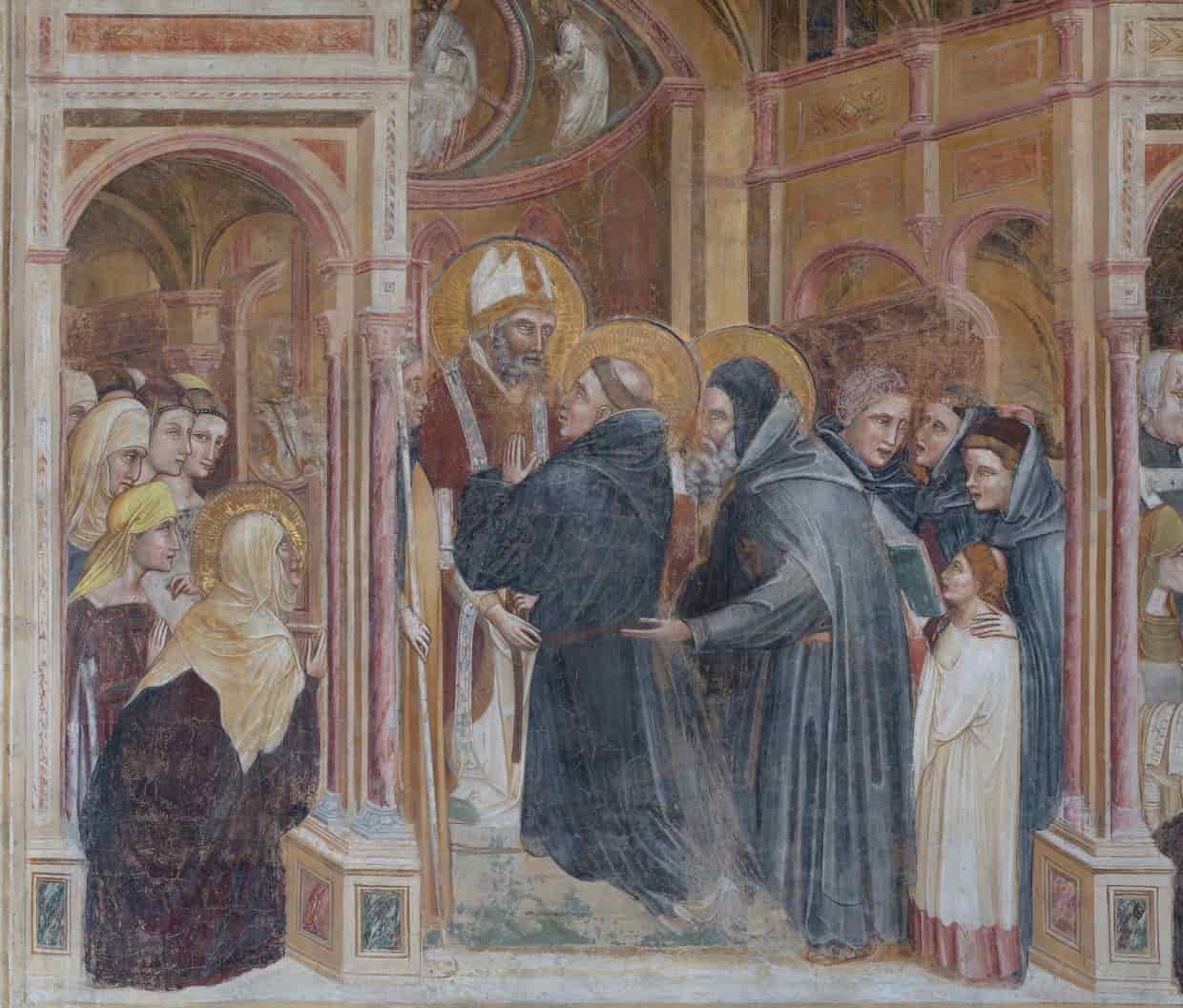 Nella cappella della famiglia Cortellieri, situata sul lato desto della navata, sono visibili alcuni resti di un ciclo pittorico realizzato da Giusto de' Menabuoi attorno al 1370 raffigurante la Gloria di Sant'Agostino con le Virtù e con le Arti Liberali. Sul lato sinistro della navata è conservato un antico orologio.