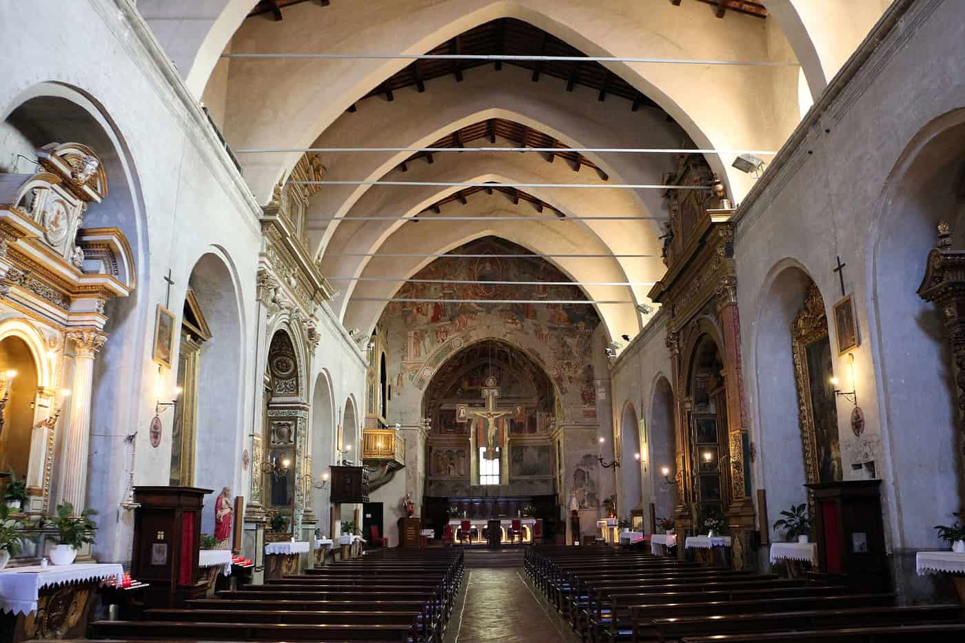 Tra le opere d’arte di maggior spicco vanno ricordate: Gesù e la Samaritana (1580), di Virgilio Nucci (prima cappella sin.); la Madonna del Soccorso, di ignoto della fine del sec. XV (5a cappella sin.); la Madonna di Grazia, affresco attribuito a Ottaviano Nelli (3a cappella d.); il Battesimo di S. Agostino (1594), di Felice Damiani (4a cappella d.). Molto interessanti gli affreschi dell’abside e dell’arco trionfale, eseguiti dal Nelli e dalla sua bottega.