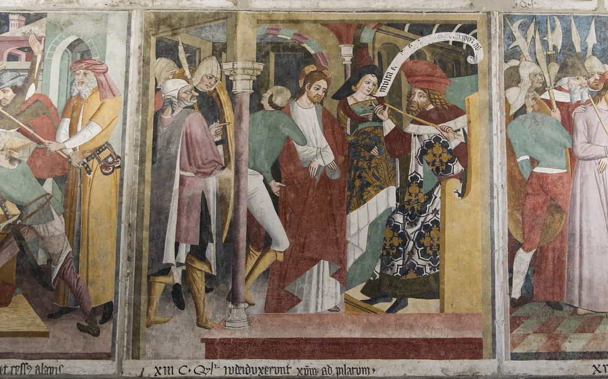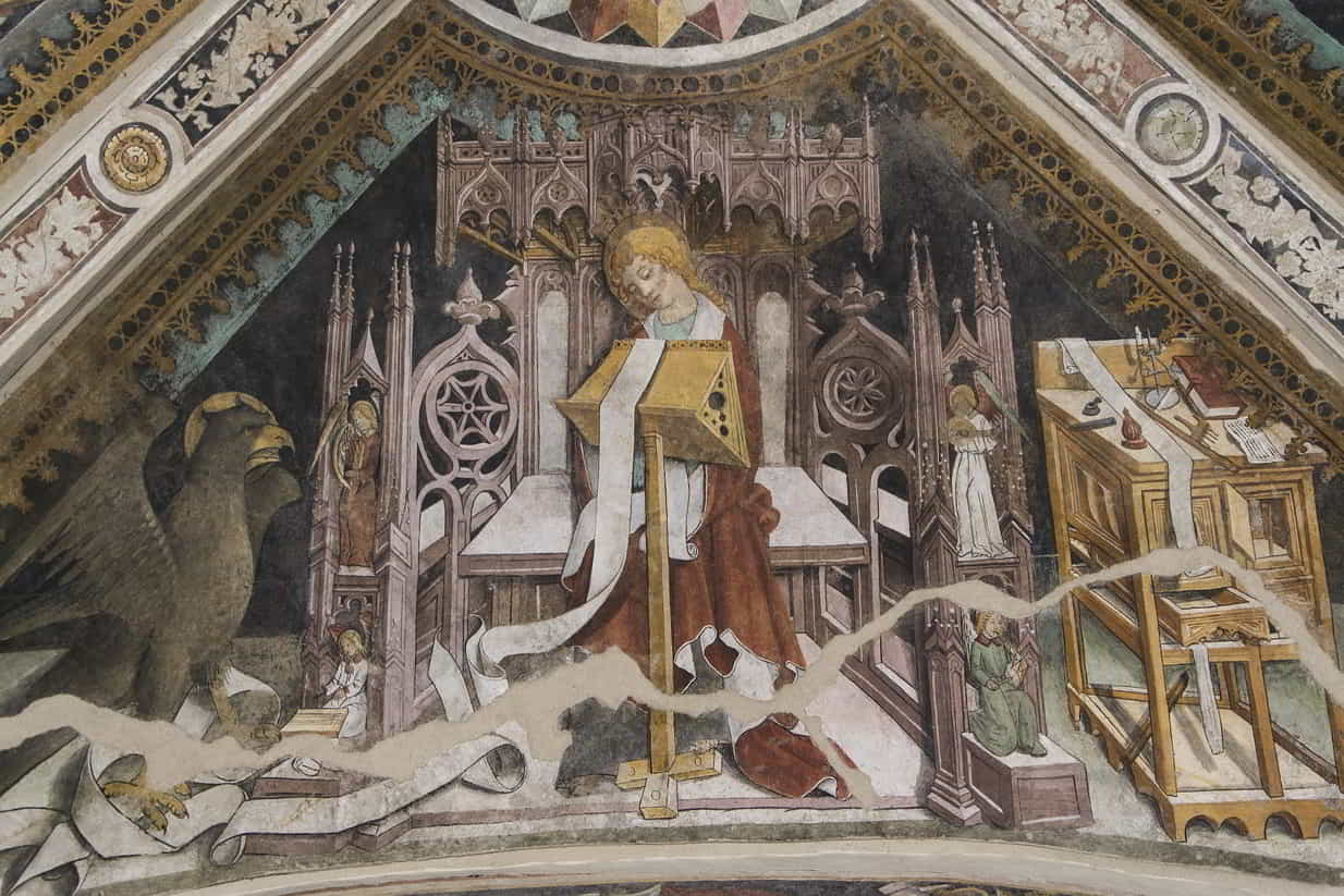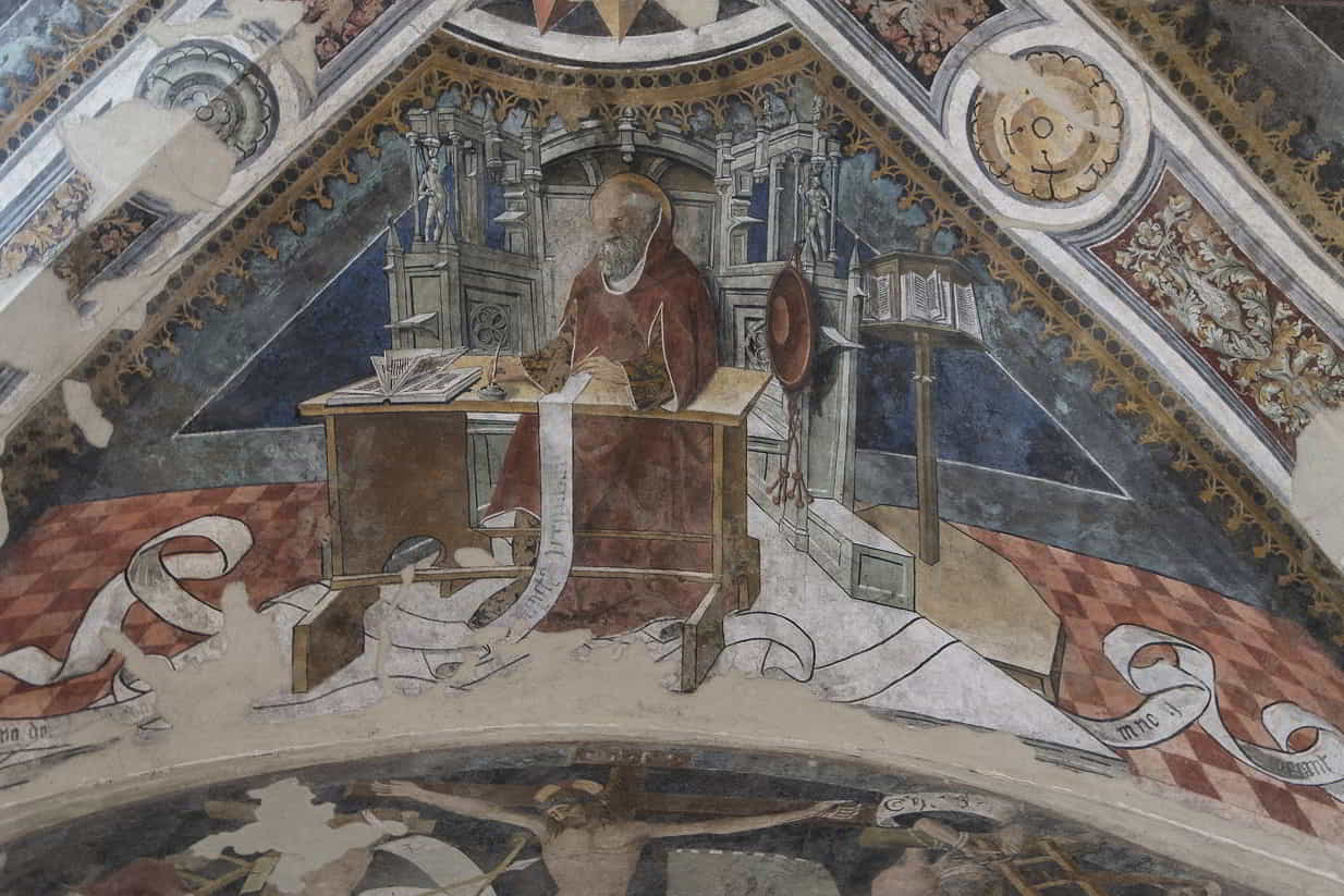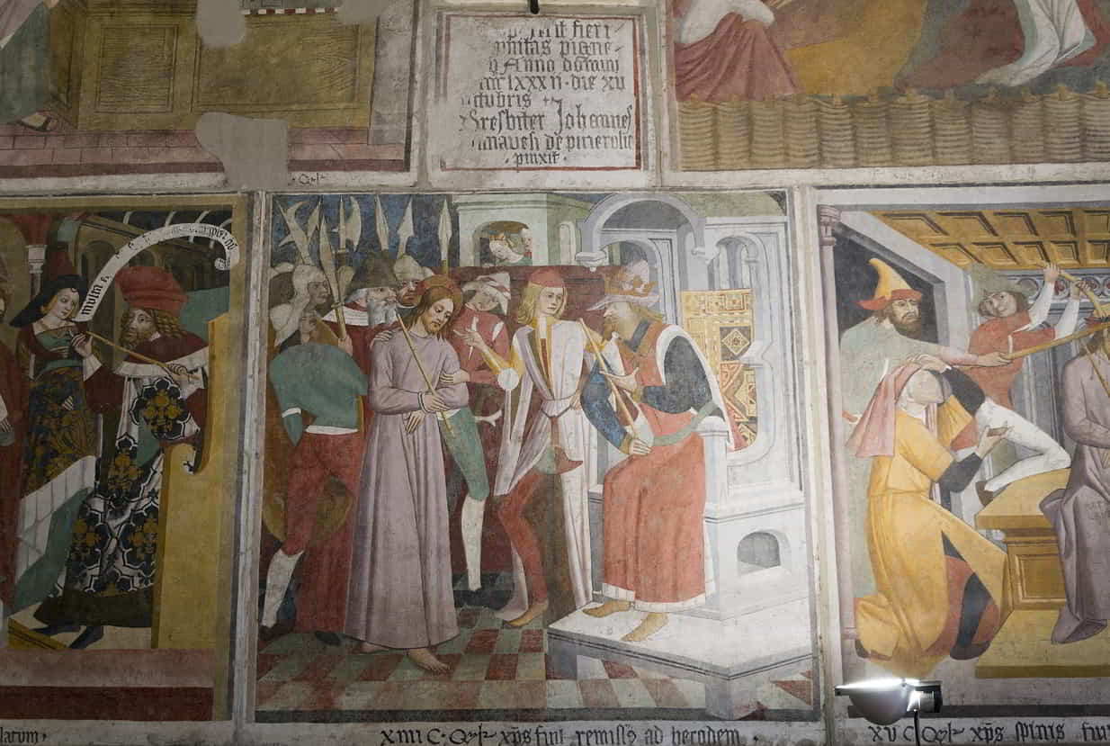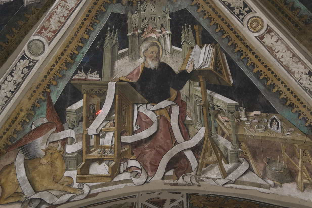 L'interno ospita uno dei più importanti cicli di affreschi del Quattrocento ligure, realizzati dal pittore Giovanni Canavesio, che li firma e data 1482, gli Evangelisti e i Dottori della Chiesa delle due volte, scene della Passione e del Giudizio Universale sulle pareti.