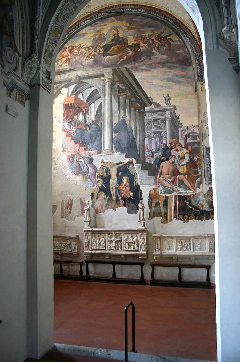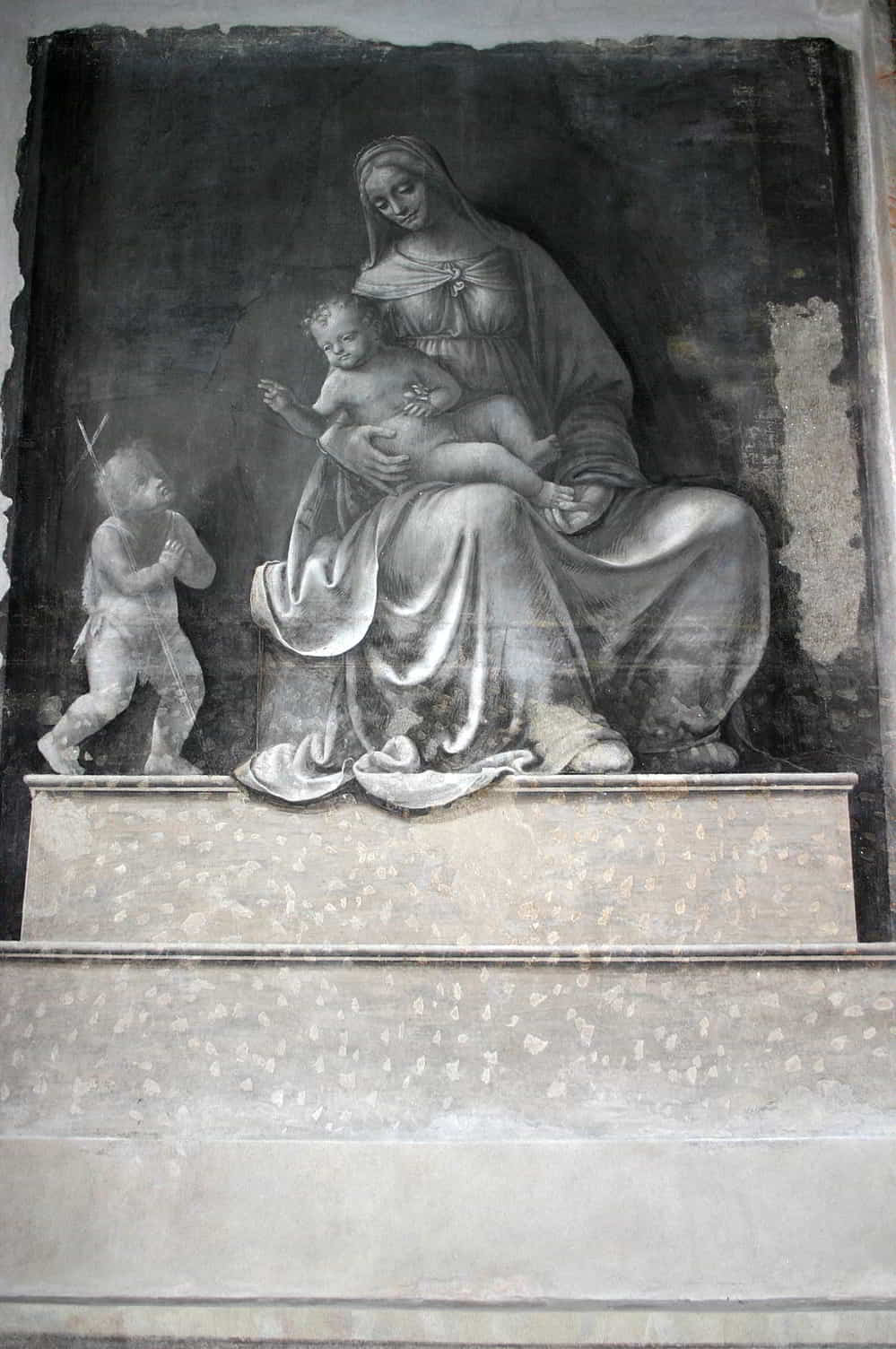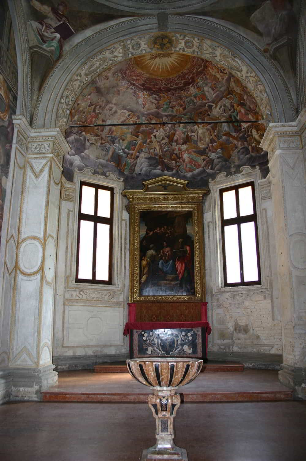 La decorazione della prima cappella della navata destra fu avviata dalla famiglia Foppa per ospitare la sepoltura di Pietro Foppa. Il monumento funebre, progettato da Bramantino, è scomparso, mentre si possono ancora ammirare gli affreschi di Giovanni Paolo Lomazzo, artista milanese di scuola manierista fortemente influenzato dall'opera di Leonardo e Michelangelo. Egli stesso narra di aver condotto l'impresa decorativa nell'anno 1570. La cappella è dedicata ai santi Pietro e Paolo, che si vedono raffigurati nella pala d'altare nell'atto di rendere omaggio alla Vergine, insieme con sant'Agostino, opera a olio sempre del Lomazzo, ideatore ed esecutore del ciclo di affreschi, deperiti dal tempo.