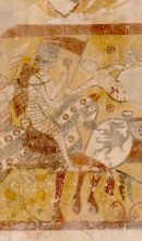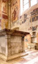 Nella cella absidale, dove compaiono anche numerosi motivi simbolici collegati con l'Ordine templare come croci cosmologiche e stelle, si susseguono dipinti (1260-1270) vicini per stile ad altri esempi perugini del XIII secolo, come quelli in San Prospero. A questa stessa fase decorativa appartengono anche gli affreschi dell'arco trionfale e della controfacciata, mentre ad un periodo successivo, databile intorno al 1280 (probabilmente coincidente con una riconsacrazione della chiesa), sono riferibili le figure di Apostoli distribuite per tutto il perimetro dell'edificio.