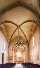 All'interno è una navata unica con due campate coperte da volte a crociera (mentre la copertura originale doveva essere a capriate); l'abside quadrata, posta al di sopra di una cripta e leggermente rialzata rispetto al piano della chiesa, è introdotta da un grandioso arco trionfale. Tutta la storia del luogo traspare in modo evidente dai cicli iconografici di diverse epoche compresenti sulle pareti: la Processione di flagellanti, la splendida Battaglia fra templari e musulmani e la breve Legenda di san Bevignate, sul cui mantello molti pellegrini e devoti incisero i propri graffiti nel corso del Quattrocento e del Cinquecento. La navata e l'abside sono ricoperte di interessanti affreschi iniziati subito dopo l'edificazione del tempio.