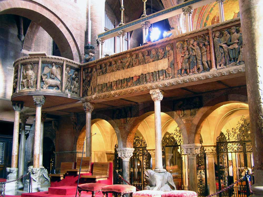 L'interno in mattoni rossi, suggestivo nella sua semplice austerità, conserva varie opere d'arte. Tra navata centrale e cripta è posto il pontile decorato dei Campionesi. Il pulpito centrale di Enrico da Campione (1322) è ornato di statuine in terracotta opera di plastici modenesi aggiunte nei secoli successivi. Pende sopra il pontile un notevole crocifisso ligneo dorato del XIII secolo.