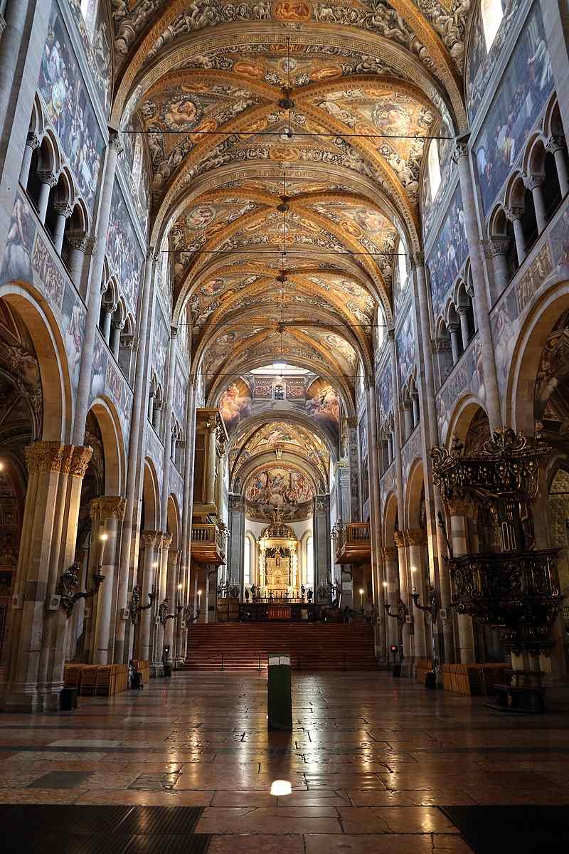 La crociera è coperta dalla cupola ottagonale, con lanterna solo all'esterno; nel tamburo, esternamente movimentato da un loggiato con trifore, si aprono otto rosoni circolari, uno per lato, frutto dell'ampliamento cinquecentesco dei precedenti, di origine romanica. La superficie interna della cupola è stata interamente affrescata con l'Assunzione della Vergine da Antonio Allegri detto il Correggio tra il 1524 e il 1530 circa.
