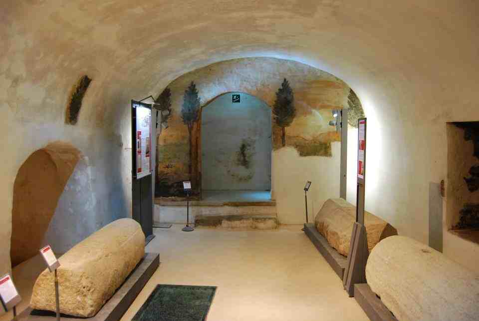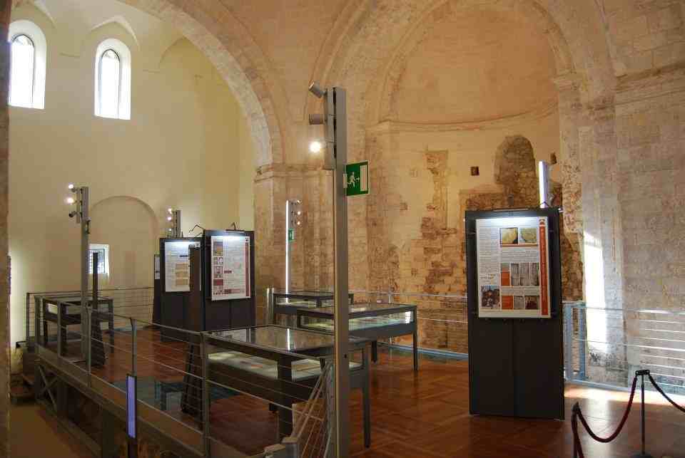 All'interno della struttura hanno trovato collocazione alcuni reperti della storia ebraica cittadina. Nella cripta sono custoditi alcuni cippi tombali provenienti dai cimiteri della comunità ebraica della città. Nella zona superiore, invece, oltre ai pannelli didattici esplicativi della storia della presenza ebraica a Trani e nel Mezzogiorno fino al XIII-XV secolo e della storia di questa sinagoga-chiesa, si conservano copie di documenti e due reperti di eccezionale valore storico: un'antica Mezuzah risalente al XII - XIII sec. e frammenti pergamenacei di un'antica Bibbia in ebraico del XIV secolo.