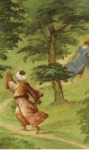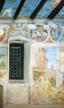 Nel sottostante emiciclo è raffigurata la Famiglia di Battista Suardi. La decorazione del soffitto e delle pareti, staccata dal pavimento a circa 1,60 m di altezza con una finta cornice lignea da spalliere, si deve a Lorenzo Lotto, ed è firmata e datata 1524 nella dedicatoria sulla parete sinistra. Durante i lavori l'artista ebbe come "discepolo" il bergamasco Francesco Bonetti (documentato dal 1517 al 1550).