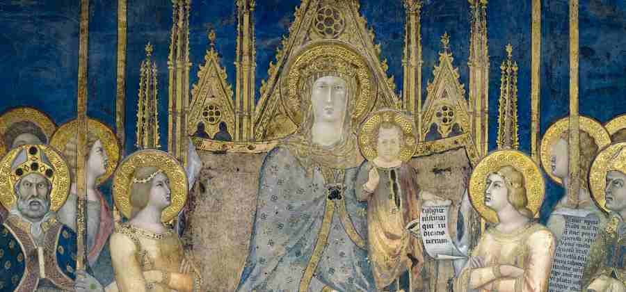 La sala di Dante deve il suo nome al breve soggiorno del grande poeta del 1300: qui in veste di ambasciatore della Repubblica fiorentina egli perorò davanti al podestà e al consiglio generale la causa di una lega guelfa Toscana. La sala è decorata dalla grandiosa Maestà di Lippo Memmi (firmata e datata 1317) , ispirata a quella dipinta dal cognato Simone Martini nel Palazzo Pubblico di Siena. Come nell'affresco senese Maria è assisa in trono circondata da uno stuolo di santi e angeli: in adorazione si scorge anche la figura dell'allora podestà Nello di Mino de' Tolomei. La successiva sala era usata dal governo cittadino. Contiene gli antichi sedili lignei intagliati e intarsiati (1475) e un Busto di San Bartolo in terracotta colorata della prima metà del XV secolo entro una nicchia. A questo piano è presente un'altra saletta con un busto di Guido Marabottini, in terracotta di fattura fiorentina del Quattrocento. Da qui parte anche la scalinata per la salita alla Torre Grossa. La pinacoteca vera e propria si trova al secondo piano.