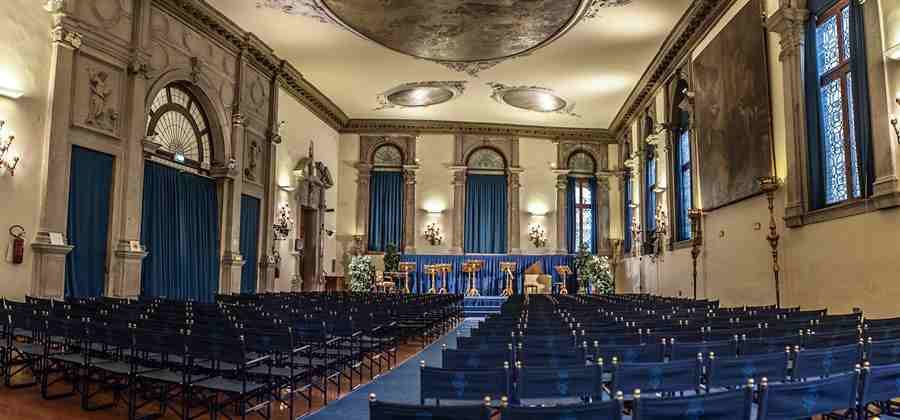 L''edificio attuale si presenta con una pianta complessa dovuta alla ristrettezza e conformazione del sito, accanto alla struttura apparentemente rettangolare (in realtà più corta sul lato interno di quasi un quinto), compresa tre il campo la calle del Lovo ed il canale, che ospita la sala capitolare ed il pian terreno, si estende un ala ancor più trapezoidale, racchiusa tra la breve salizada San Todaro ed il canale, che include oltre allo scalone, la sagrestia del pian terreno e la sala dell'archivio oltre ad altri piccoli ambienti residui di servizio.