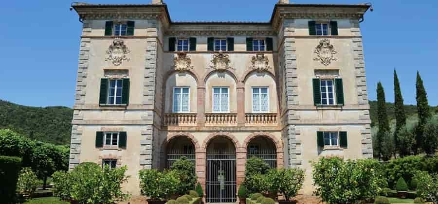 L'asse, che è stato utilizzato anche come viale d'accesso, ha vari manufatti che lo intervallano, punti da cui la villa appare come un mero apparato di contorno al giardino: un'esedra, un lungo viale di cipressi e un monumentale portale, da cui si raggiunge la villa attraverso un tapis vert. Il portale, ornato internamente sui lati d'entrata da due nicchie con statue colossali di Captivi, realizzate da Giuseppe Mazzuoli, è completato in alto da obelischi e busti scultorei decorativi.