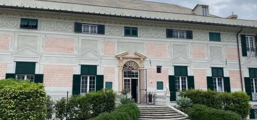 Sulla destra della facciata principale, rivolta verso il mare, in contrasto con l'aspetto di tranquilla residenza di campagna dell'edificio è presente una torretta quadrangolare, che testimonia, insieme con le garitte poste agli angoli dell'edificio al piano sottotetto, un'originaria funzione difensiva. Nelle volte delle logge e del salone è presente un ciclo di affreschi di "Storie romane", opera di Bernardo Castello (1583); tra questi notevole quello raffigurante "Coriolano e la madre" nella volta del salone.