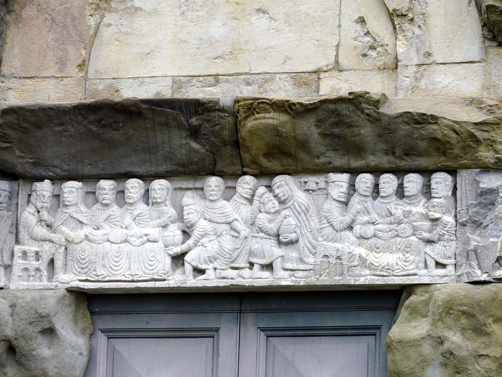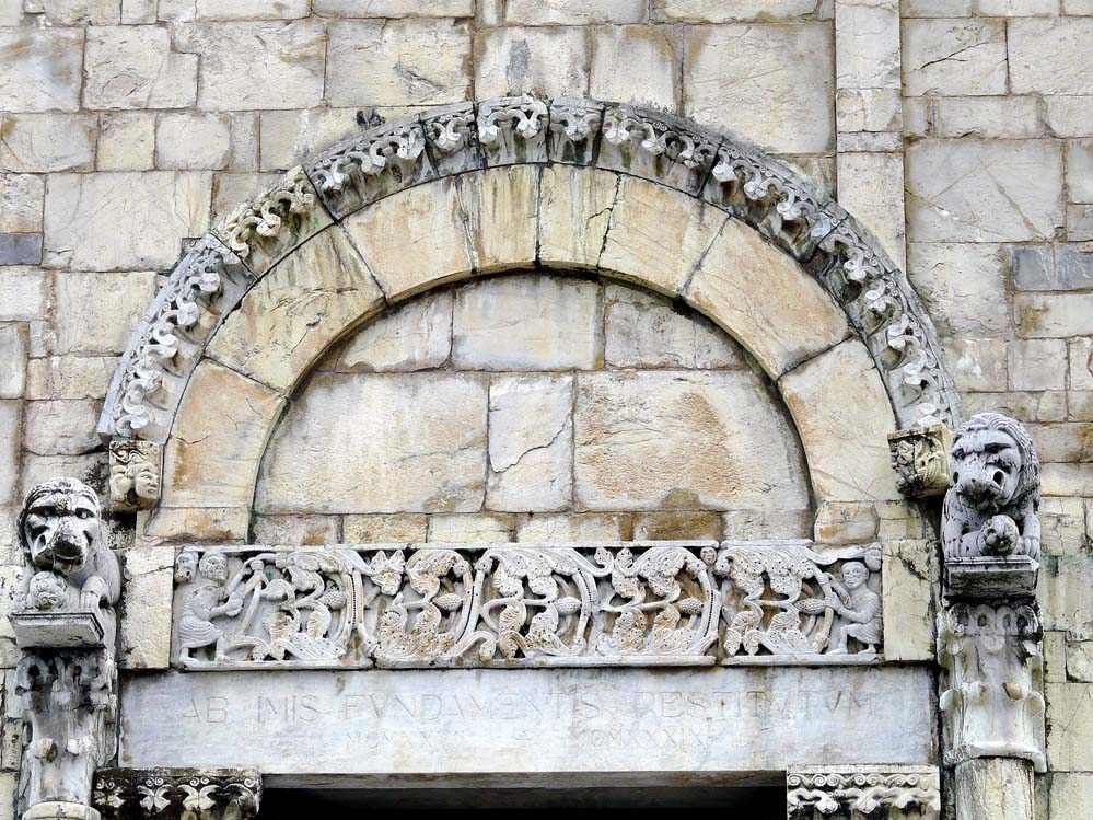 Il rivestimento esterno dell'attuale facciata è stato realizzato con bozze di pietra detta Alberese di Barga. La porta maggiore è sovrastata da un arco scolpito a foglie di acanto. con un architrave a bassorilievo, raffigurante una scena vendemmiale. La porta è fiancheggiata da due colonne, alla cui sommità sono posti due leoni, che simboleggiano la forza della fede. La porta laterale, quella che guarda verso la Loggetta del Podestà, è sovrastata da un bassorilievo attribuito allo scultore romanico Biduino (XII secolo), opera di grande interesse artistico che raffigura una scena conviviale, il Miracolo dello "Scifo d'Oro" di San Nicola.