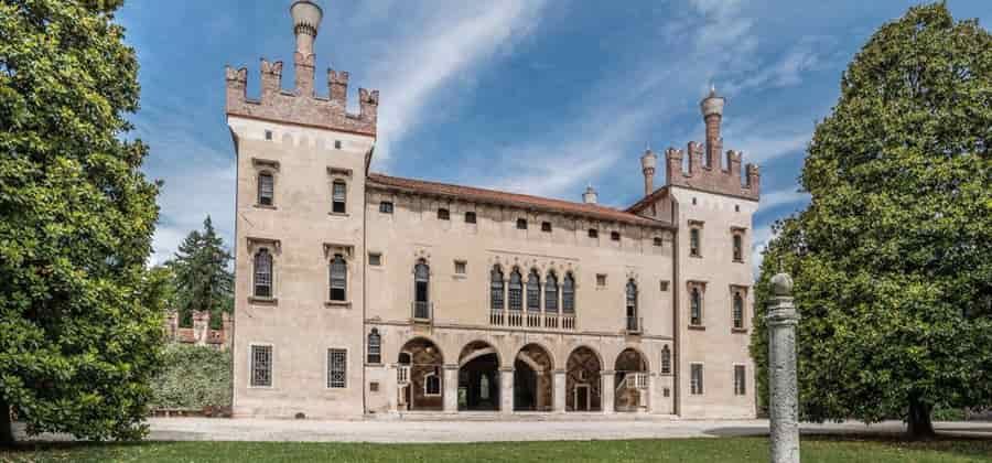 Il castello di Thiene, chiamato anche palazzo (o villa) Porto Colleoni Thiene. La denominazione "castello" non è propriamente corretta, anche se la struttura lo ricorda, viste le due torri laterali e la cinta di mura merlata; sarebbe più opportuno definirlo palazzo o, meglio ancora villa, dato che è un ottimo esempio di residenza di campagna pre-palladiana. In ogni caso resta un unicum nel suo genere, visto che si colloca appunto tra il castello medievale e la villa palladiana. Viene definito "castello" perché nella memoria della popolazione locale è stato sempre chiamato così.