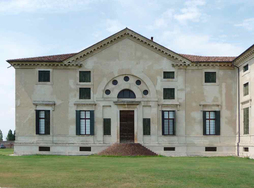 Più in generale sembra che Palladio ricerchi la logica per così dire utilitaria dell’architettura termale antica, con un linguaggio straordinariamente sintetizzato nelle forme e astratto, quasi metafisico. In questa villa Andrea Palladio rinuncia quasi totalmente ai particolari decorativi: la facciata non è articolata in un loggiato o in un pronao sporgente, ma è chiusa, crea una architettura sobria, misurata, di grande armonia. Privo di capitelli e trabeazioni, l’ordine architettonico è appena accennato nell’articolazione essenziale delle basi dei pilastri. L’assenza di ordini e di parti in pietra lavorata (se non nei portali della loggia) deve avere assicurato una globale economicità nella realizzazione dell’opera, confermata dall’uso del mattone intonacato e del cotto sagomato, sul quale il recente restauro ha trovato traccia di policromie.