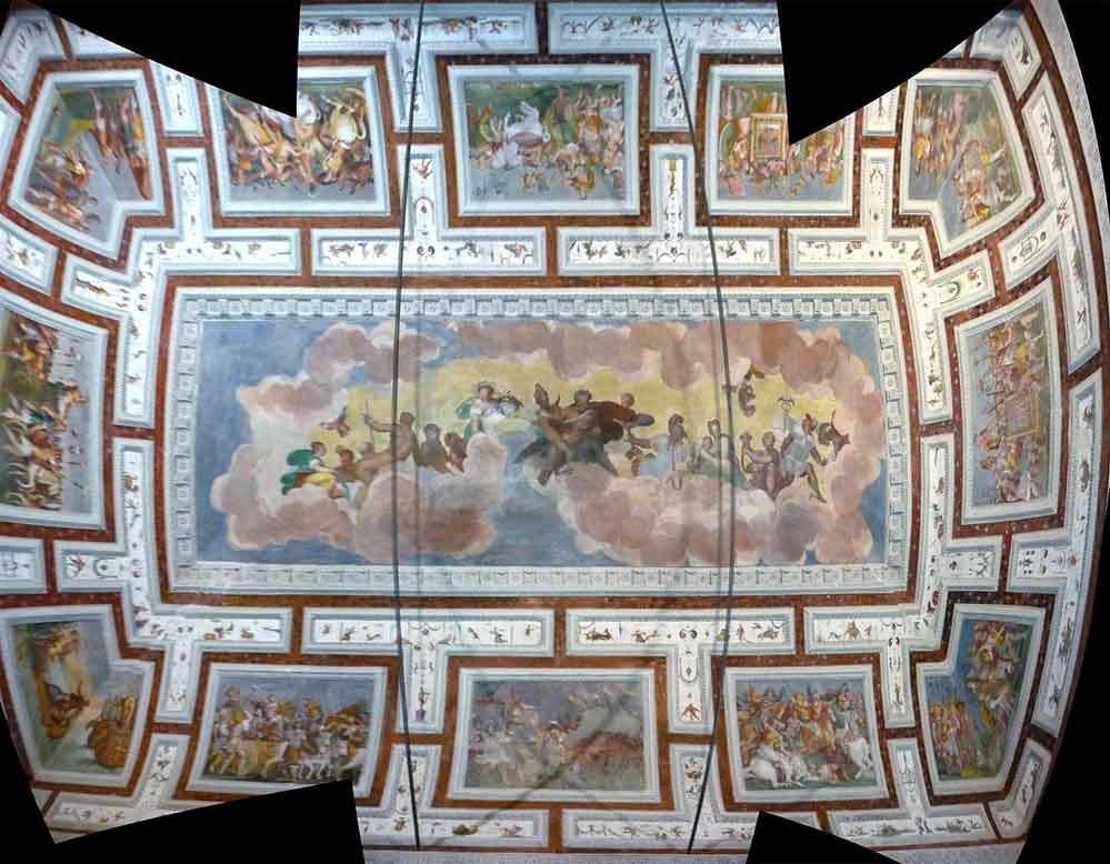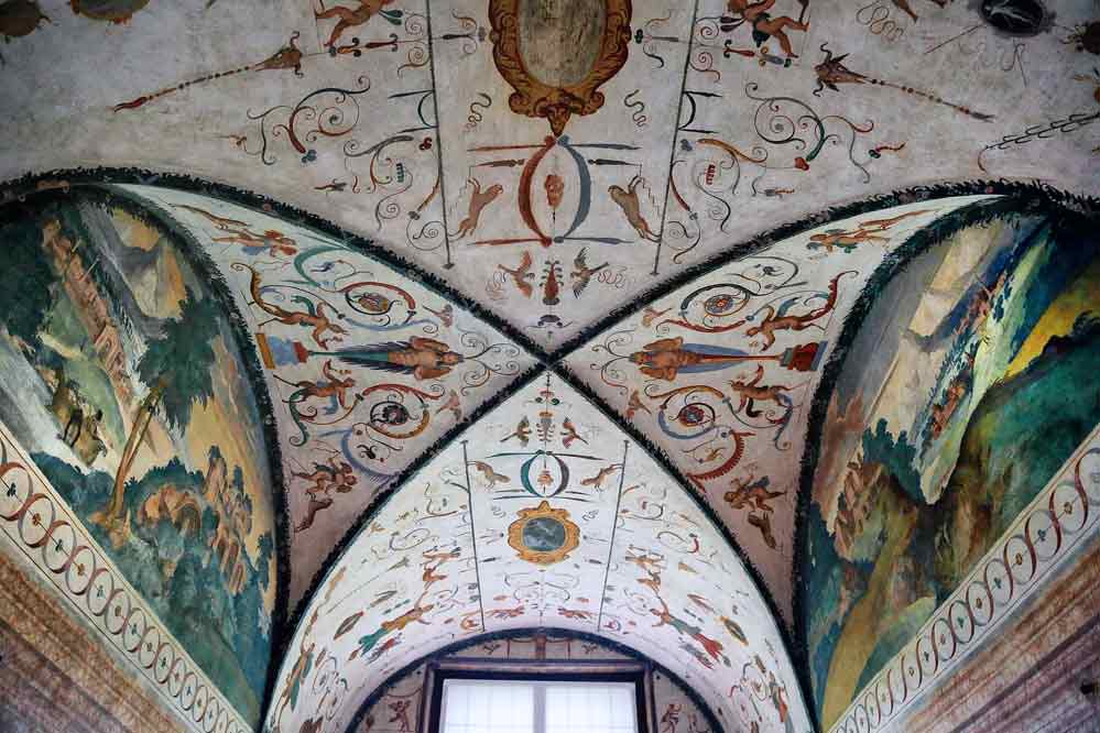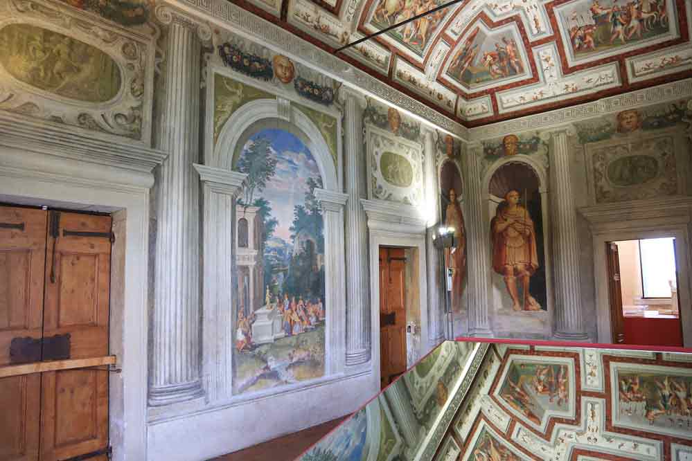 Gli affreschi più significativi si possono trovare nella sala principale: chiamata salone dell'imperatore, ritrae una famiglia dei tempi classici, i cui membri sono vestiti di tuniche e toghe. Essi si inginocchiano davanti a un altare, mentre il pater familias spegne la fiaccola di guerra ai piedi della statua della Pace collocata sopra l'altare. Si tratta di una chiara allusione alla pace faticosamente raggiunto nel XVI secolo dopo la guerra della Lega di Cambrai, che ha consentito ai Veneziani di godere i piaceri della terraferma.