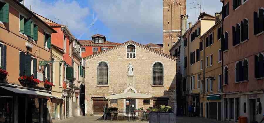 Sulla semplice facciata a capanna in laterizio, risalta il grande portale dal tipico arco inflesso veneziano culminato da un fiorone. Nella lunetta ogivale sta un bassorilievo attribuito ad Antonio Rizzo (1478), reso particolare dai consistenti resti di dipintura policroma sulle vesti, gli alberi e lo sfondo, che rappresenta San Marco che guarisce sant'Aniano. Sulla trabeazione sotto la lunetta tre raffigurazioni di calzature fanno da contorno ad alcune iscrizioni commemorative.