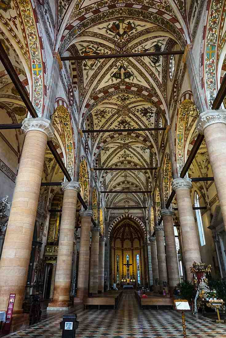 La chiesa costituì per Verona l'episodio gotico di maggiore portata, negli anni immediatamente successivi alla sua costruzione divenne quindi un punto di riferimento su cui si baseranno i progetti di diversi altri edifici chiesastici, in particolare per quanto riguarda alcune innovazioni che Santa Anastasia apportava alla pianta, con lo sviluppo di un ampio transetto e l'articolazione della zona absidale in quattro cappelle ai lati del presbiterio ove è collocato l'altare maggiore, alla struttura muraria completamente in laterizio e alla nuova tipologia di campanile. La facciata, a parte un maestoso portale biforo in stile gotico attraverso il quale si accede nel vasto spazio interno diviso in tre navate da monumentali pilastri cilindrici, si presenta incompiuta. Ai lati delle due navate laterali si aprono alcune cappelle e numerosi altari, di cui il più celebre è l'altare Fregoso realizzato da Danese Cattaneo, elogiato anche da Giorgio Vasari, inoltre si possono ammirare tele e affreschi di noti maestri della pittura veronese e no, quali Pisanello, Altichiero, Liberale da Verona, Stefano da Zevio, Nicolò Giolfino, Girolamo dai Libri, Giovan Francesco Caroto, Felice Brusasorzi, Francesco Morone, Michele da Verona, Lorenzo Veneziano.